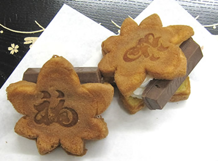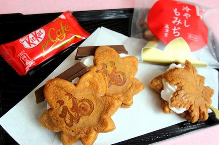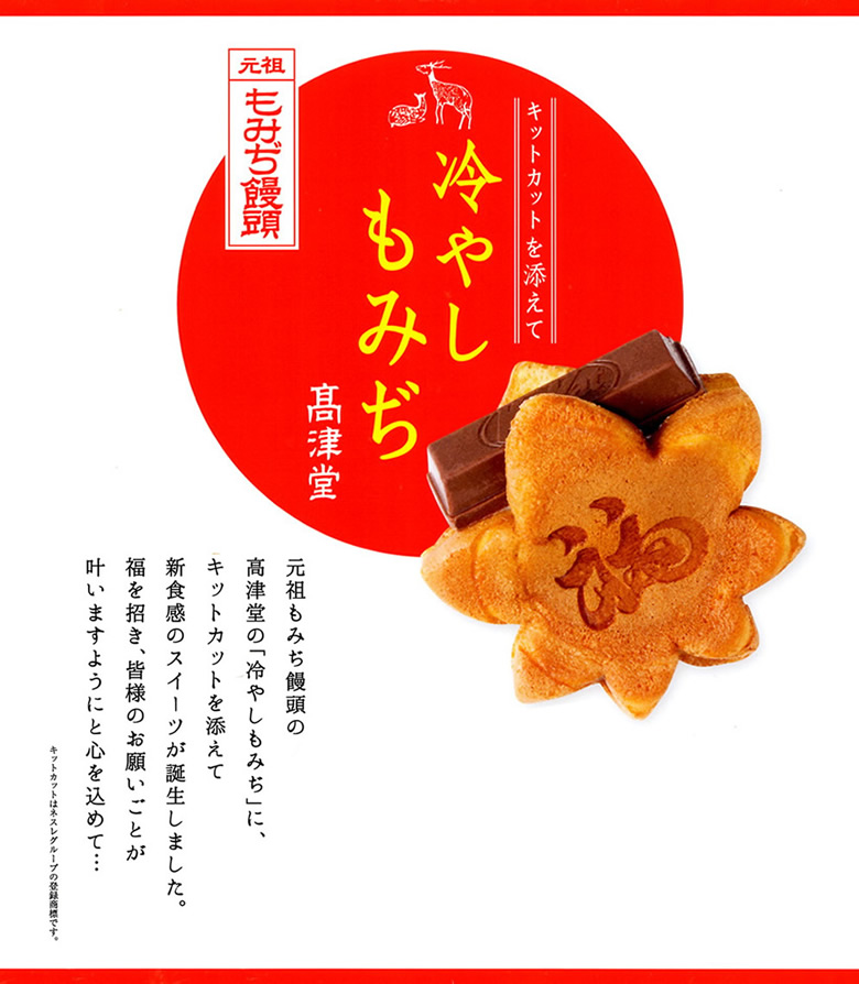 冷やしもみぢに「キットカットを添えて」新食感のスィーツです。 世界初の外食専用のキットカットフォーカフェ! サクサク感が口当たりよく仕上がりました。 商品は冷凍品ですが、少し解凍してお召し上がりください。 縁起を担いで、「福」の焼印。皆様のお願い事が叶います様にと心を込めて