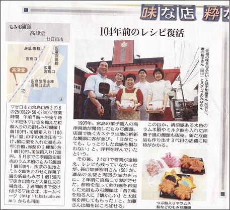 2011年07月20日 [高津堂からのお知らせ] 台風6号が猛威を振るいつつ北上しております。 台風の被害にあわれた皆様に謹んでお見舞いを申し上げます。 こんにちは、高津堂店主の 加藤です。 さて、先日 読売新聞の水曜日限定のコーナー 味な店 粋な店 旬な店 の枠で、 高津堂が紹介されました! ![]() 「104年前のレシピ復活」というタイトルで もみぢ饅頭 元祖の常助の事から新商品の ラムネ餡の事まで ご紹介頂きました。 掲載された写真は私と妻、そして職人さんの 清水さん親子、スタッフのエミちゃんです。 力強いこのメンバーに毎日支えられながら、これからも おいしいもみぢ饅頭を提供していきます。 ![]() |