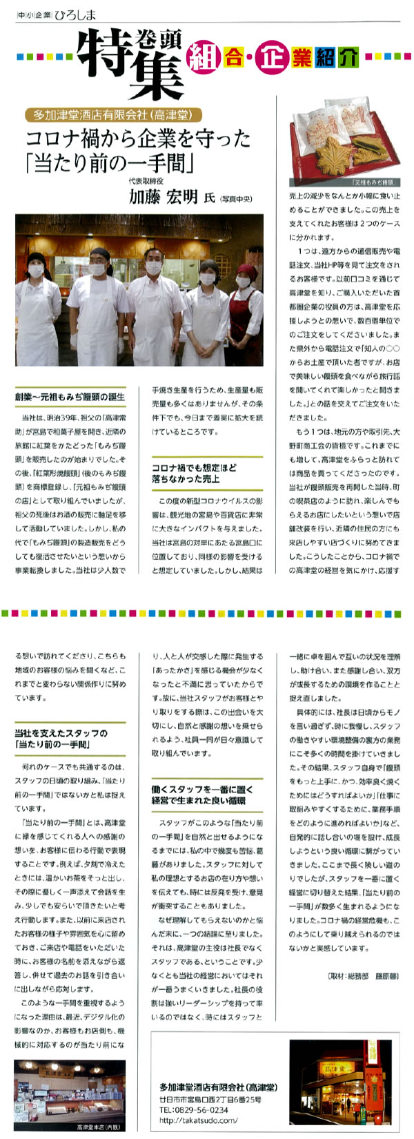 広島中央企業団体中央会の会報誌「中小企業ひろしま(No.765)」で、高津堂を巻頭特集で紹介して頂きました。