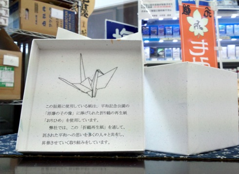2013年02月16日 [スタッフ日誌] 折り鶴の再利用・昇華(しょうか)の取り組みをしています! こんにちは、高津堂 店主の加藤です。 高津堂の小さな取り組みをご紹介します。 ![]() 高津堂ではこのほど、広島平和公園に捧げられた 折り鶴の 再生紙を使った箱の販売をはじめました。 箱には折り鶴のイラストが入り、折り紙の色が ちりばめられています。 この箱は もみぢ饅頭を5個入れることが出来、 中身がなくなった後も小物入れなどとして利用できるくらい しっかりとした作りの箱になっています。 ここ、広島には 厳島神社(廿日市市宮島)・原爆ドーム(広島市中区)と 2つの世界遺産がありますが 原爆ドームがある 広島平和記念公園の「原爆の子の像」には 日本全国・世界各国から 折り鶴(千羽鶴)が贈られており 園内はカラフルな 折り鶴と共に平和の祈りに包まれています。 そんな「祈り」が込められた折り鶴は これまで焼却という形で 昇華する方法がとられていましたが、近年では広島市が 「折り鶴再生モデル事業」を進めており 広島県内でも各社で 折り鶴再生紙を使用した商品の開発が行われています。 (折り鶴が再生紙に生まれ変わるまで/広島市制作の動画) ![]() 高津堂のこの箱にも、原爆の子の像に捧げられた 折り鶴の再生紙「おりひめ」を使用されています。 この再生紙の利用で 収益金の一部が業者様を通じて 広島市の平和貢献事業に寄付されます。1箱300円でご用意しております。 箱の取扱いは本店でのみ(通信販売も可)となりますが ご興味のある方は是非お声かけくださいませ。 ![]() |